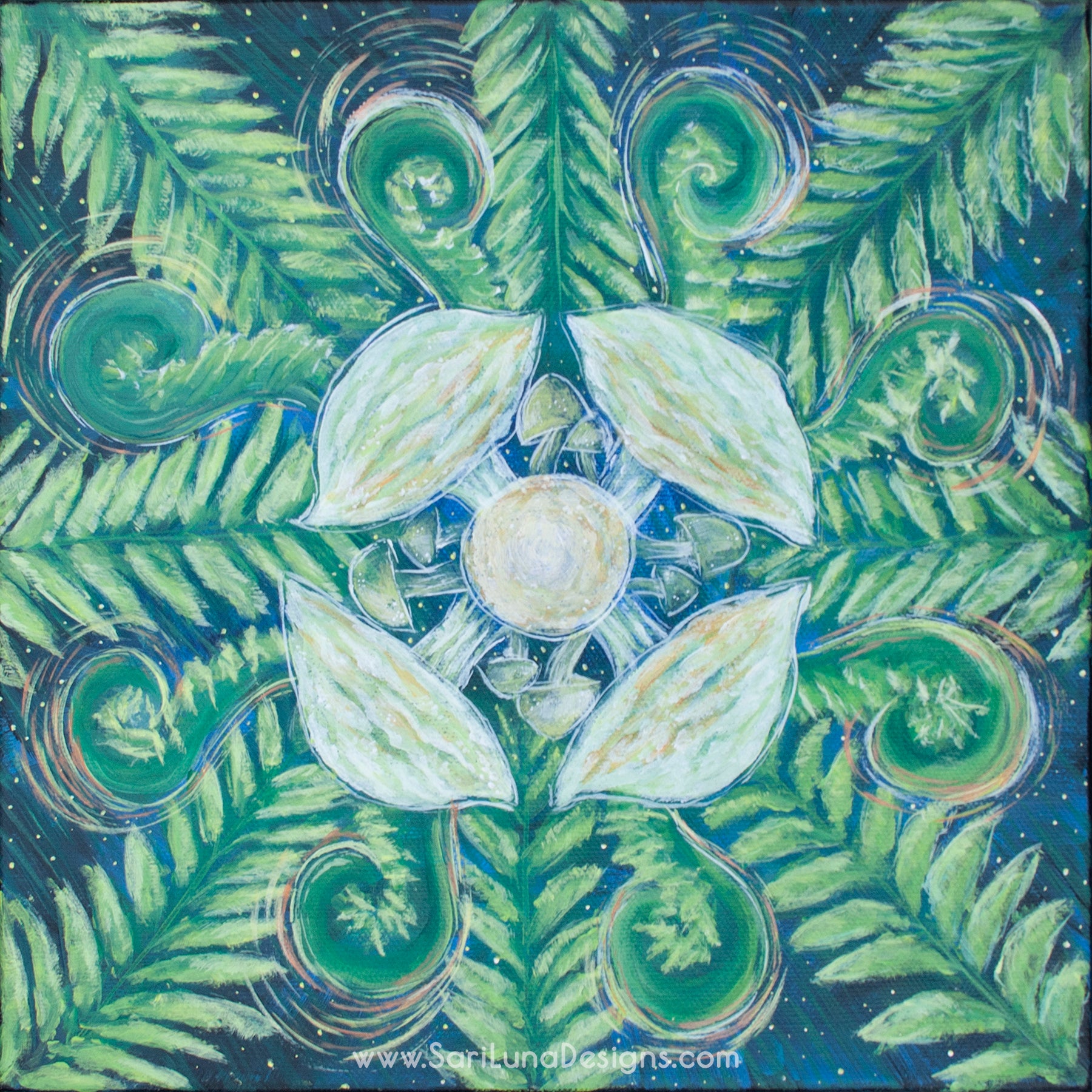 Ferns, fiddlehead and mushrooms dance under the starlit sky in this dreamy painting. Enjoy the magic of the woods with this beauty hanging in your home.